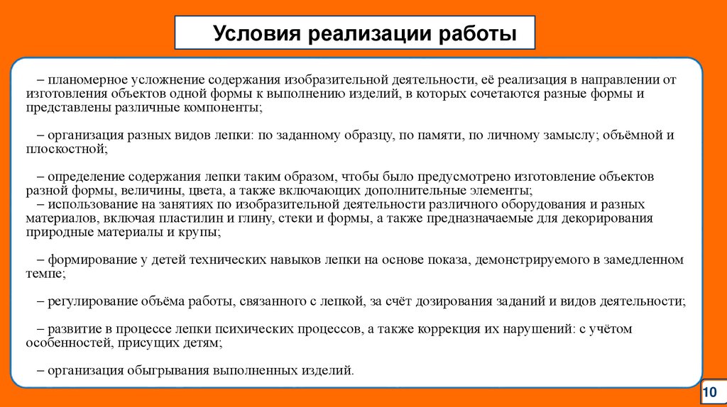 Условия реализации работы– планомерное усложнение содержания изобразительной деятельности, её реализация в направлении от