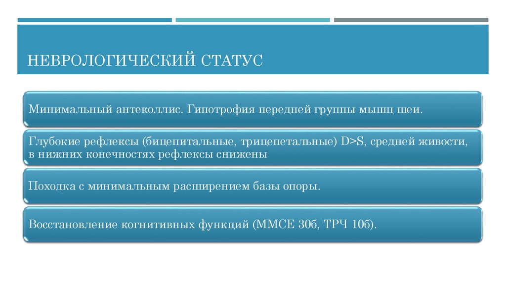 НЕВРОЛОГИЧЕСКИЙ СТАТУСМинимальный антеколлис. Гипотрофия передней группы мышц шеи.