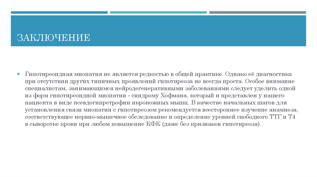 ЗАКЛЮЧЕНИЕГипотиреоидная миопатия не является редкостью в общей практике. Однако её диагностика