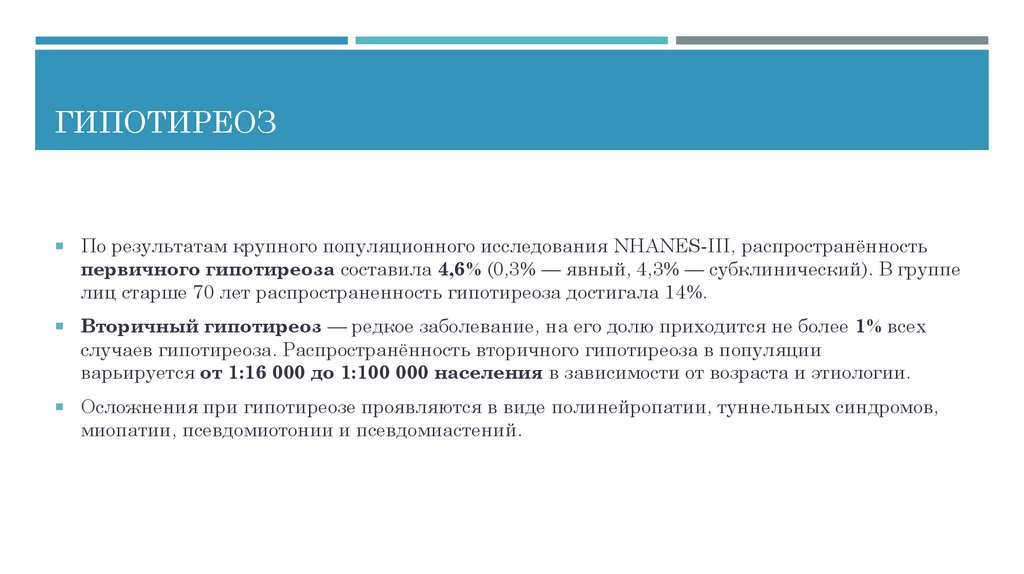 ГИПОТИРЕОЗПо результатам крупного популяционного исследования NHANES-III, распространённость