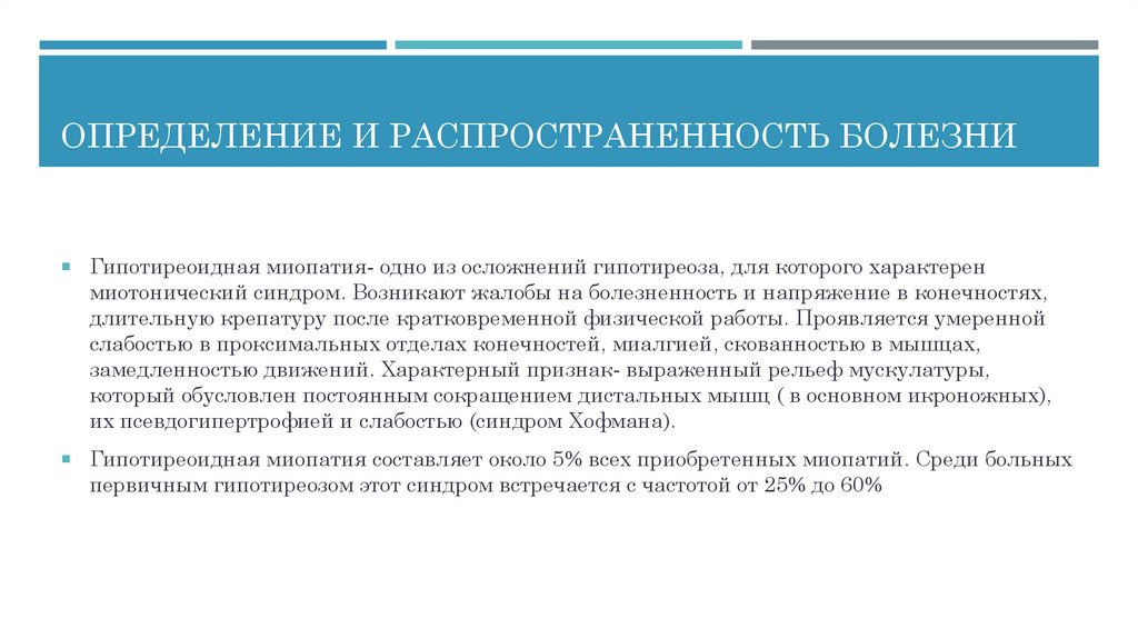 ОПРЕДЕЛЕНИЕ И РАСПРОСТРАНЕННОСТЬ БОЛЕЗНИГипотиреоидная миопатия- одно из осложнений гипотиреоза, для которого характерен