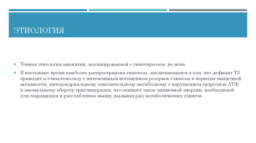 ЭТИОЛОГИЯТочная этиология миопатии, ассоциированной с гипотиреозом, не ясна.