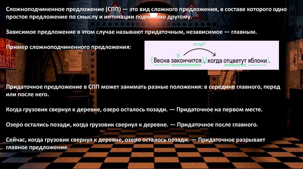 Сложноподчиненное предложение (СПП) — это вид сложного предложения, в составе которого однопростое предложение по смыслу и интонации подчинено другому.
