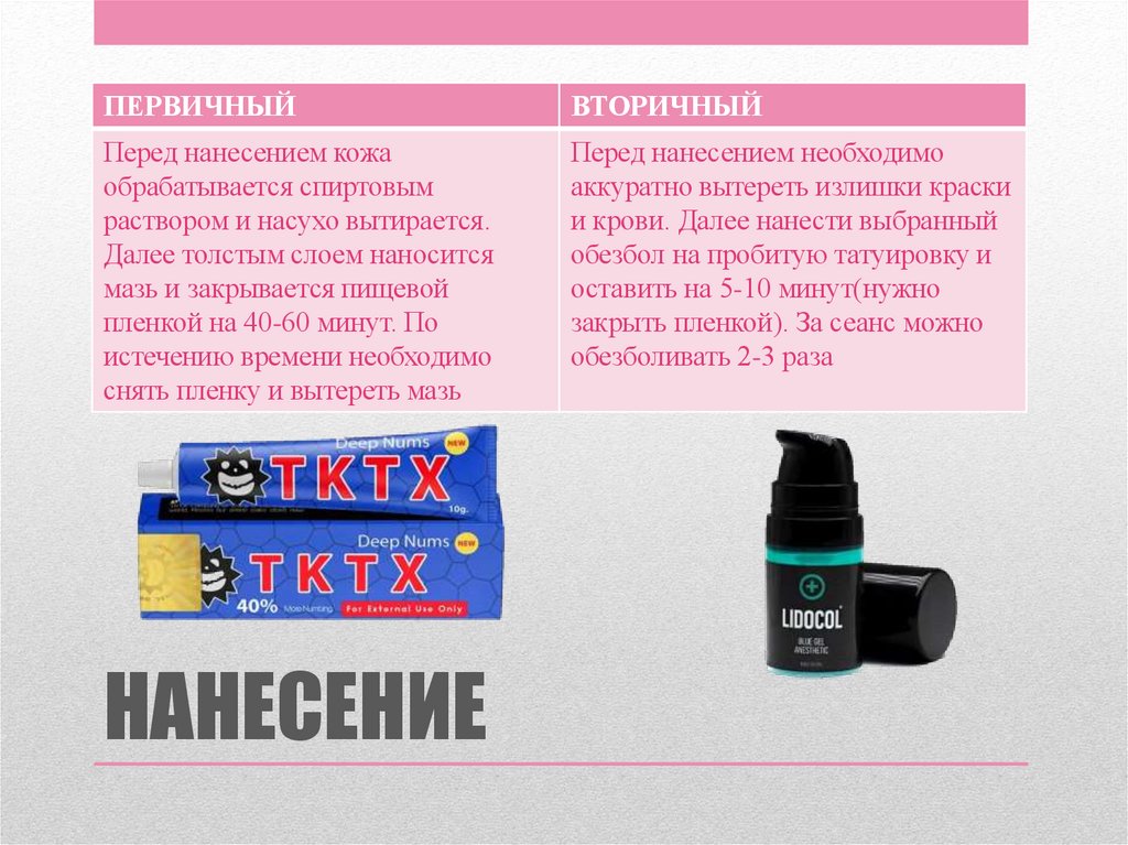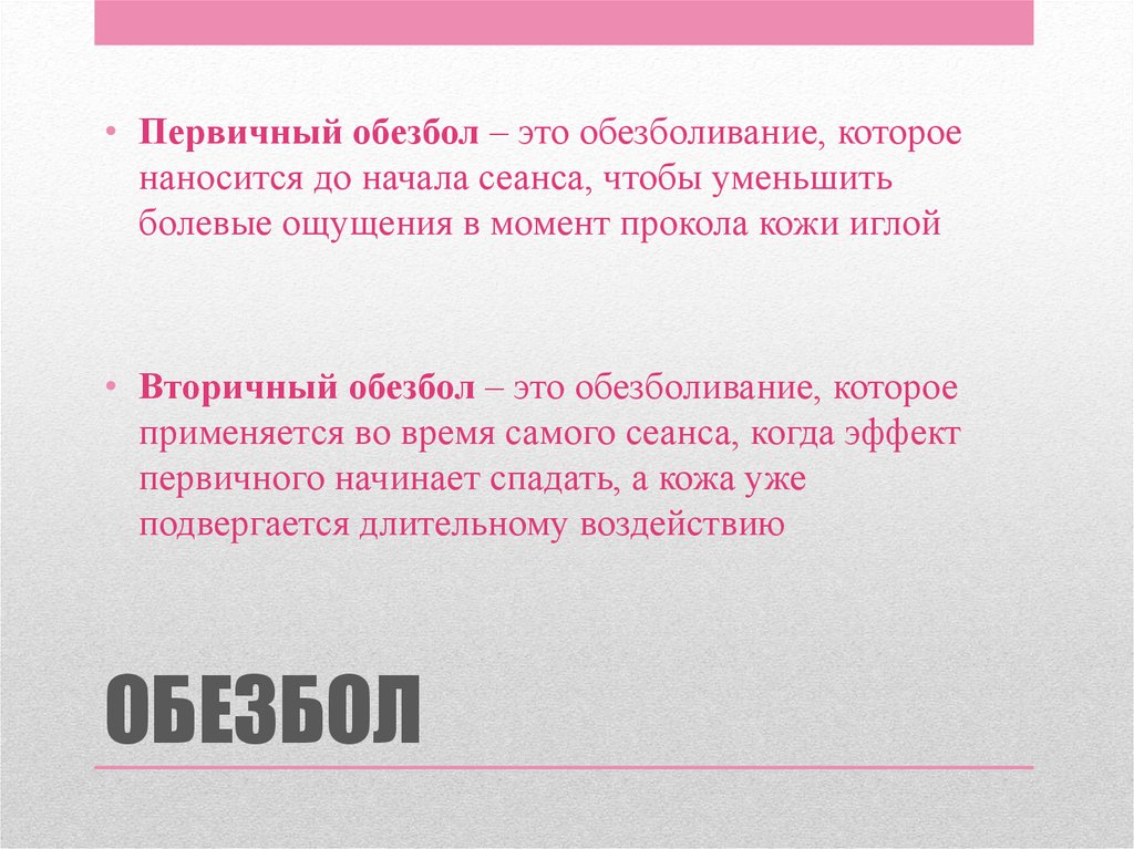 • Первичный обезбол – это обезболивание, котороенаносится до начала сеанса, чтобы уменьшить