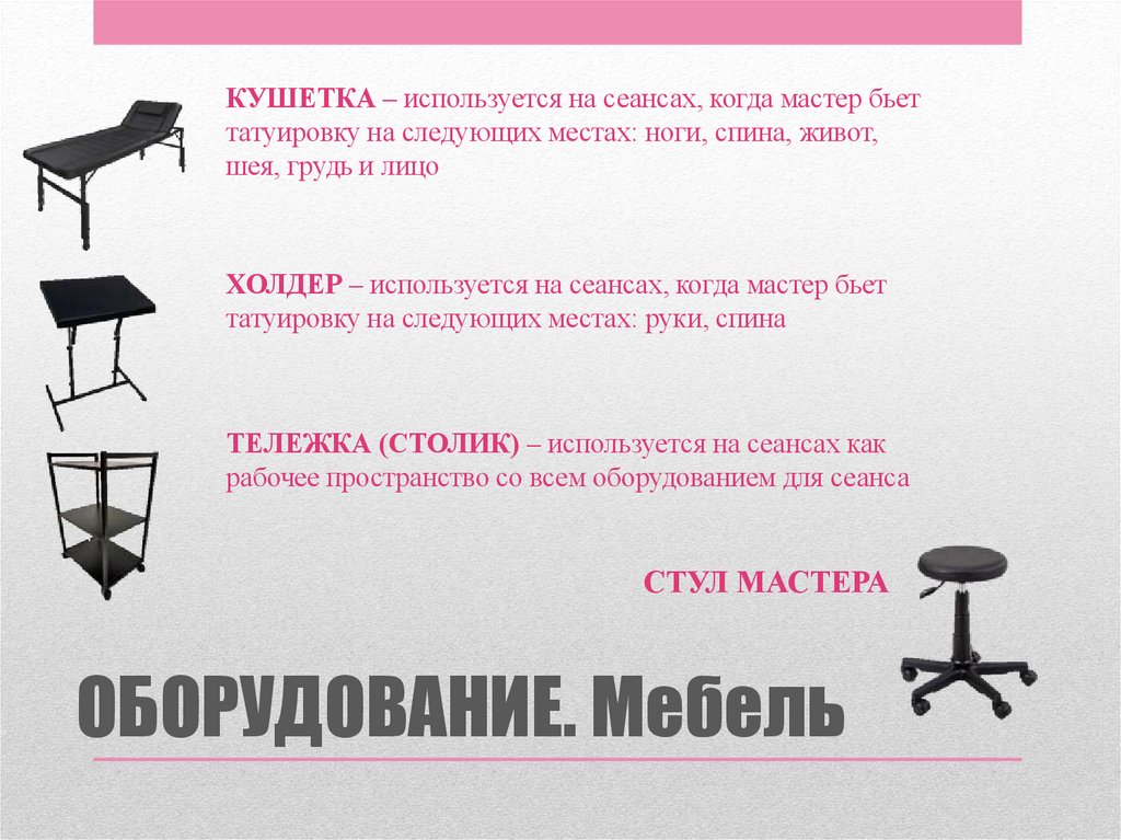 КУШЕТКА – используется на сеансах, когда мастер бьеттатуировку на следующих местах: ноги, спина, живот,