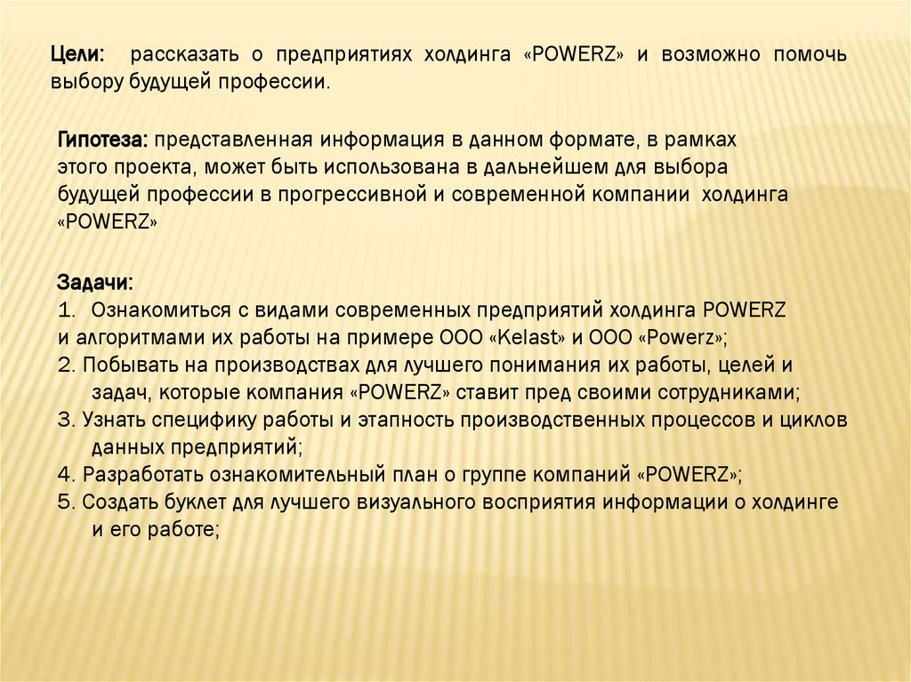 Цели: рассказать о предприятиях холдинга «POWERZ» и возможно помочьвыбору будущей профессии.