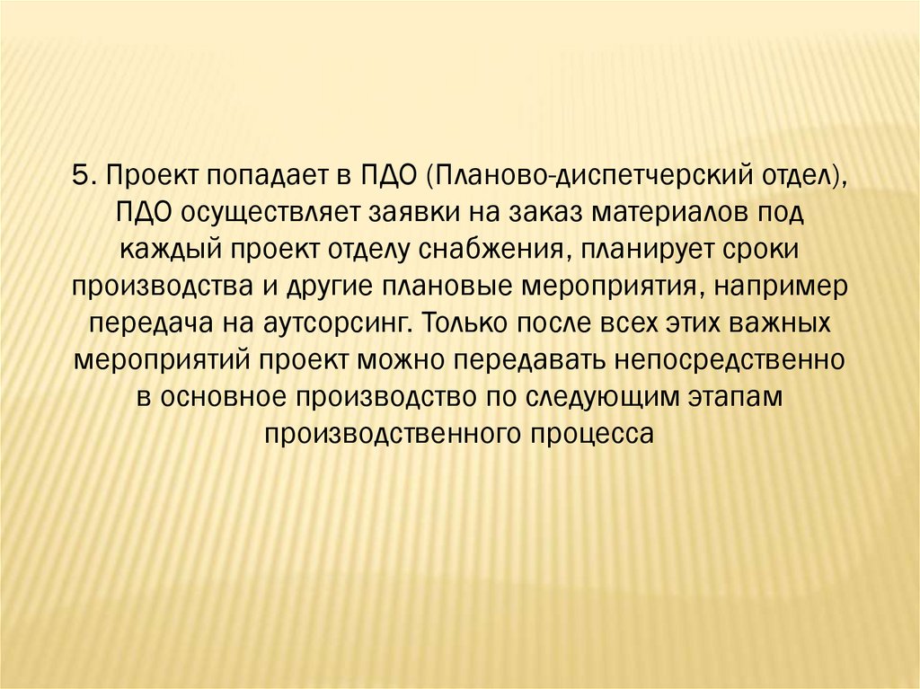 5. Проект попадает в ПДО (Планово-диспетчерский отдел),ПДО осуществляет заявки на заказ материалов под