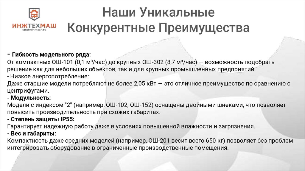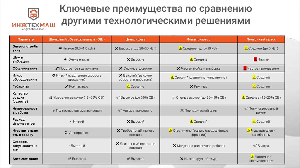 Возможность дообработки шлама до состояния технически сухого осадка.