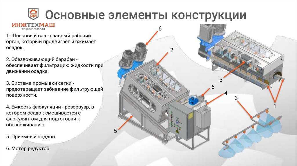 2. Обезвоживающий барабан обеспечивает фильтрацию жидкости при