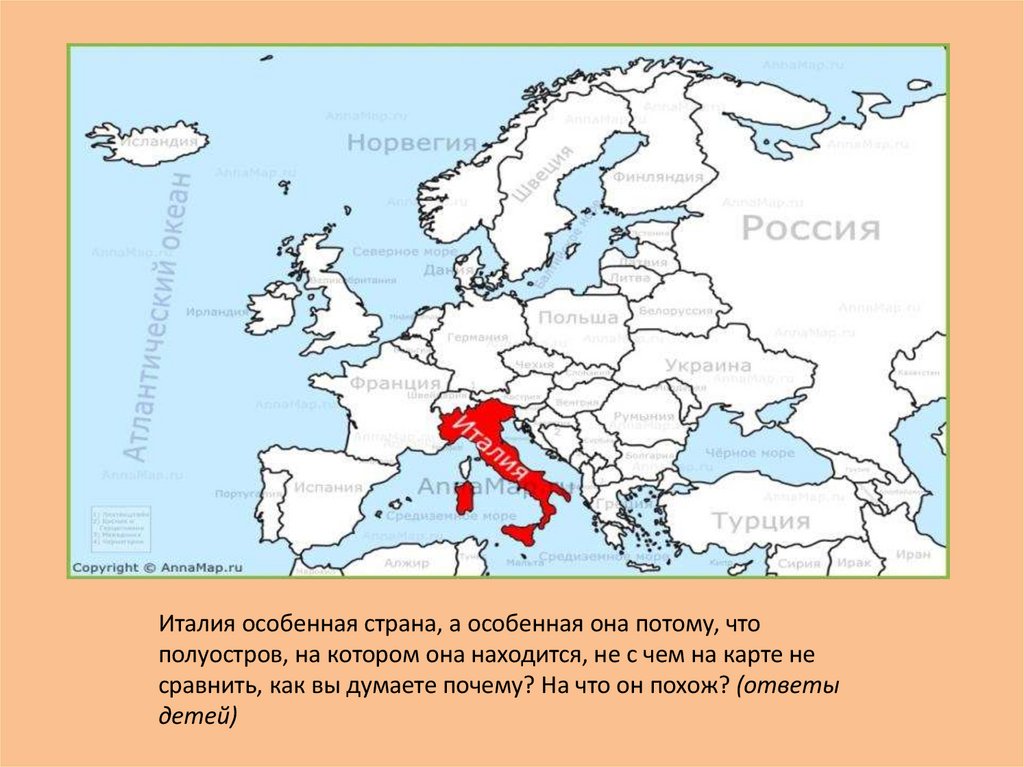 Италия особенная страна, а особенная она потому, чтополуостров, на котором она находится, не с чем на карте не