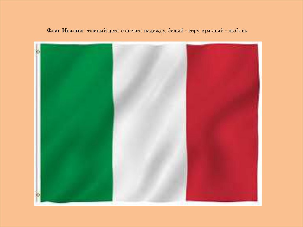 Флаг Италии: зеленый цвет означает надежду, белый - веру, красный - любовь.4.