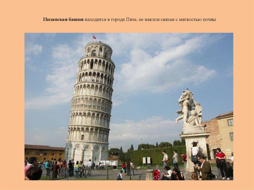 Пизанская башня находится в городе Пизе, ее наклон связан с мягкостью почвы.7.