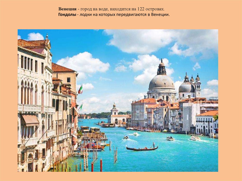 Венеция - город на воде, находится на 122 островах.Гондолы - лодки на которых передвигаются в Венеции.