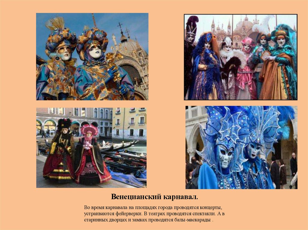 Венецианский карнавал.Во время карнавала на площадях города проводятся концерты,
