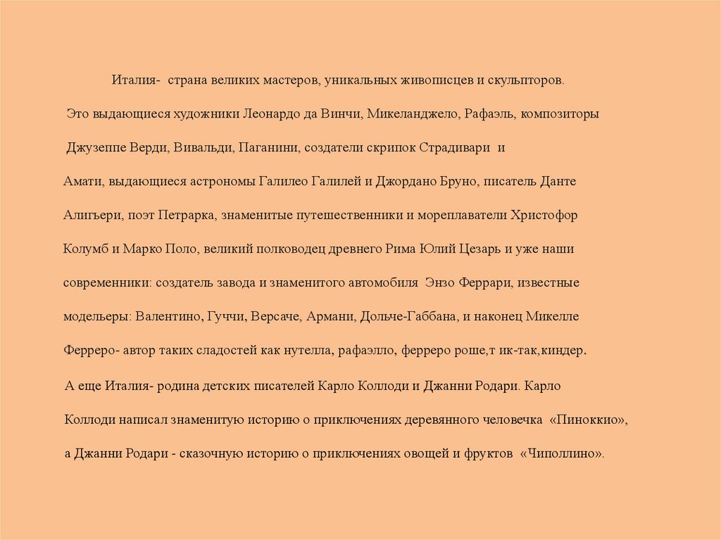 Италия- страна великих мастеров, уникальных живописцев и скульпторов.Это выдающиеся художники Леонардо да Винчи, Микеланджело, Рафаэль, композиторы