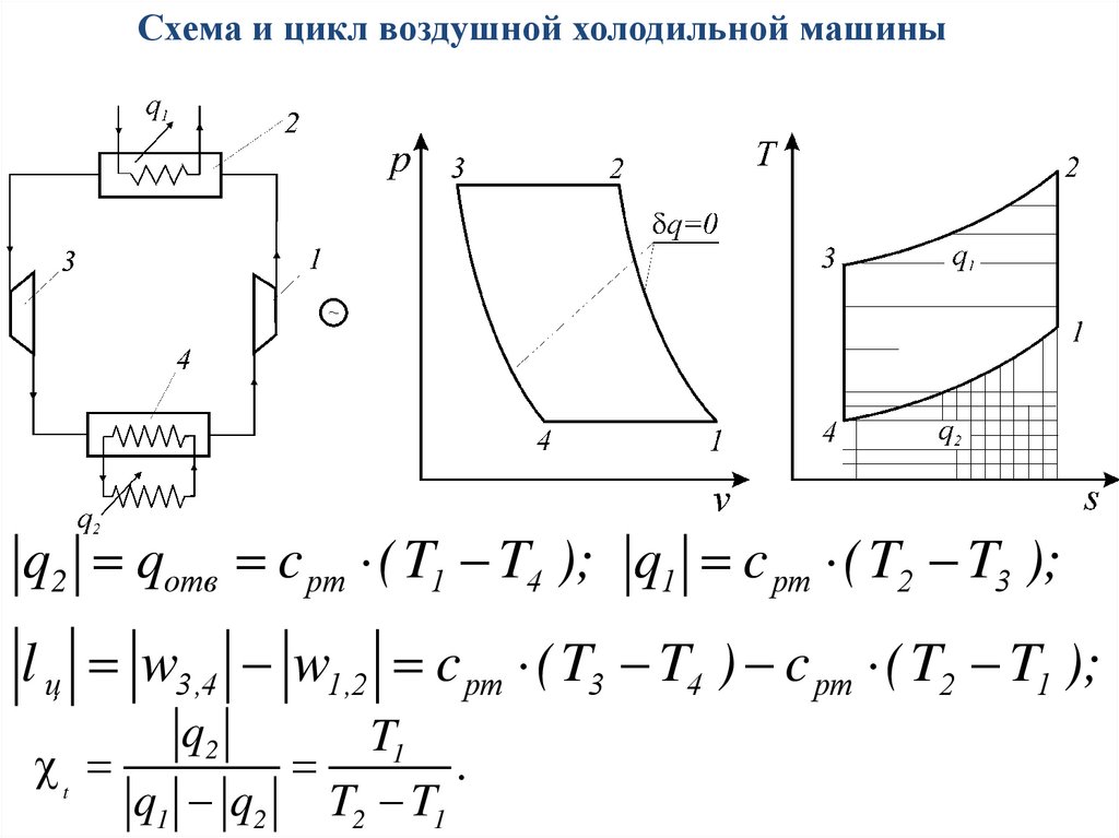 Схема и цикл воздушной холодильной машиныq2 qотв c pm ( T1 T4 ); q1 c pm ( T2 T3 );