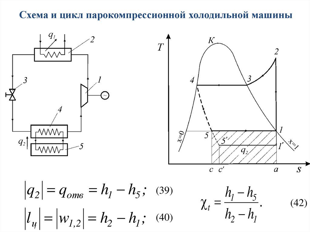 Схема и цикл парокомпрессионной холодильной машиныq2 qотв h1 h5 ; (39)