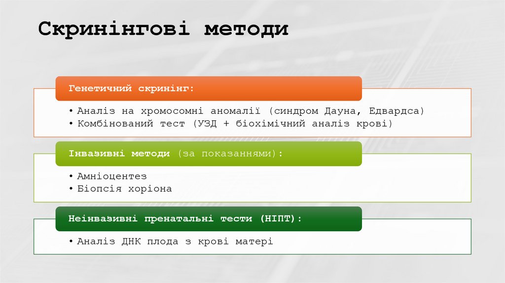 Генетичний скринінг:• Аналіз на хромосомні аномалії (синдром Дауна, Едвардса)