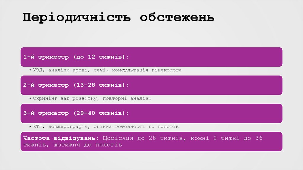 Частота відвідувань: Щомісяця до 28 тижнів, кожні 2 тижні до 36
