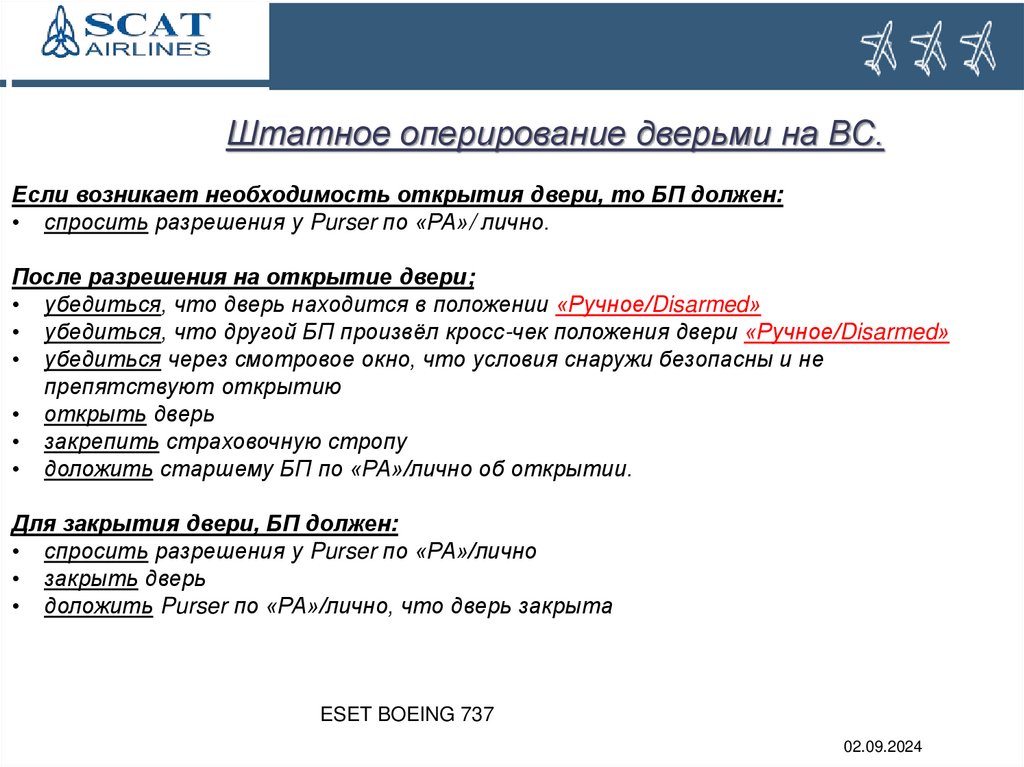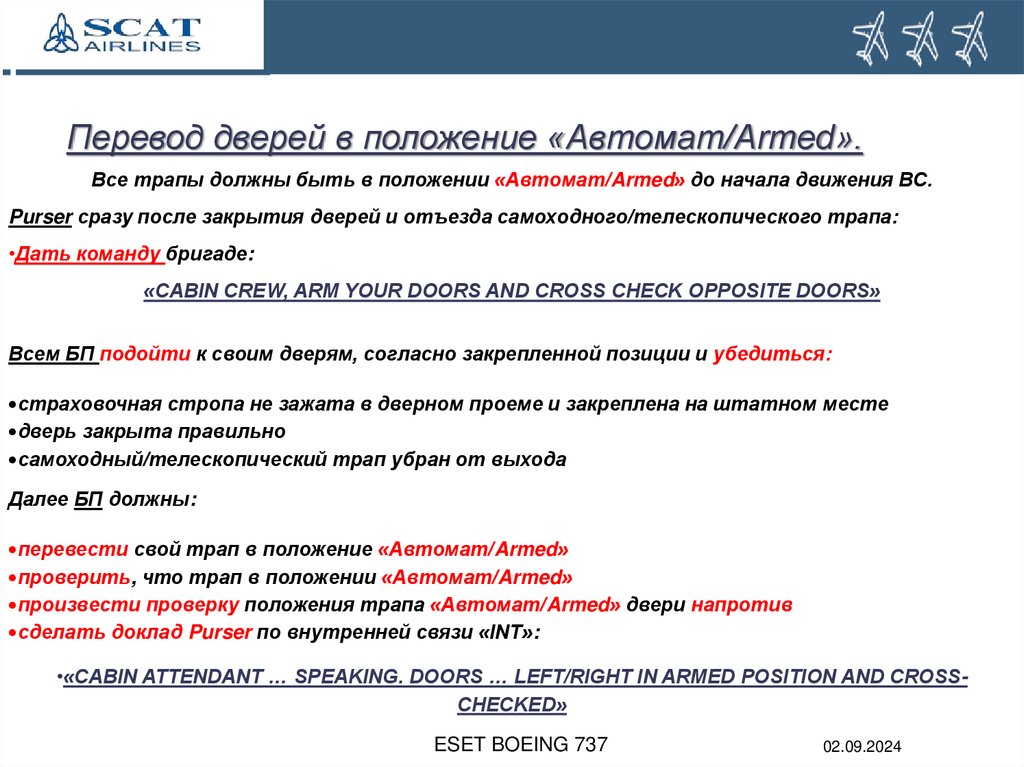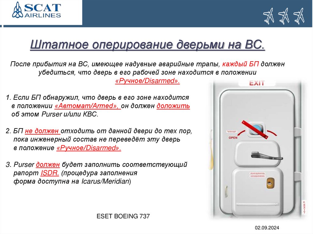 Штатное оперирование дверьми на ВС.После прибытия на ВС, имеющее надувные аварийные трапы, каждый БП должен