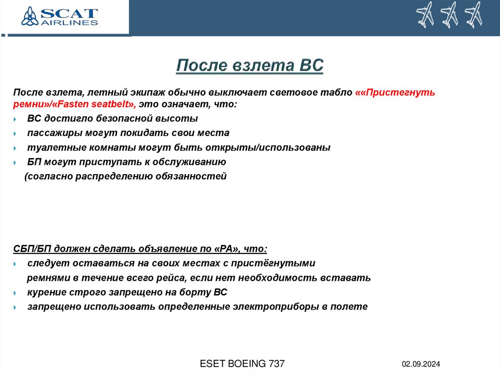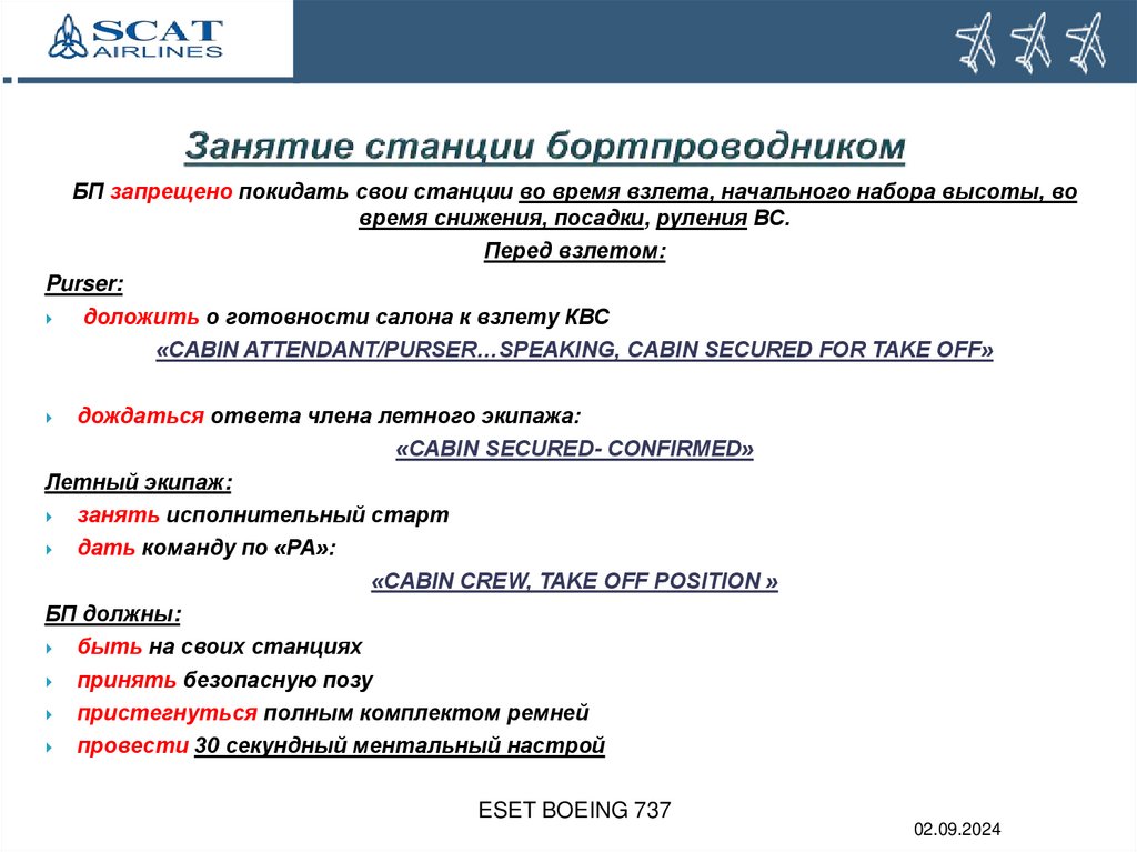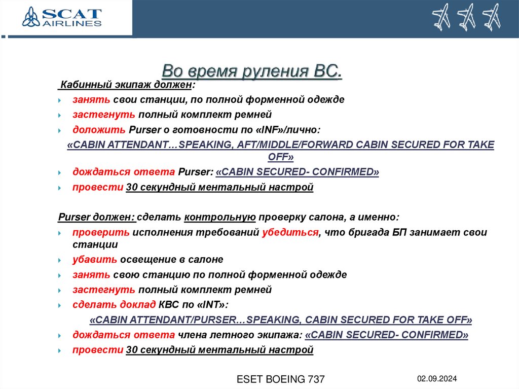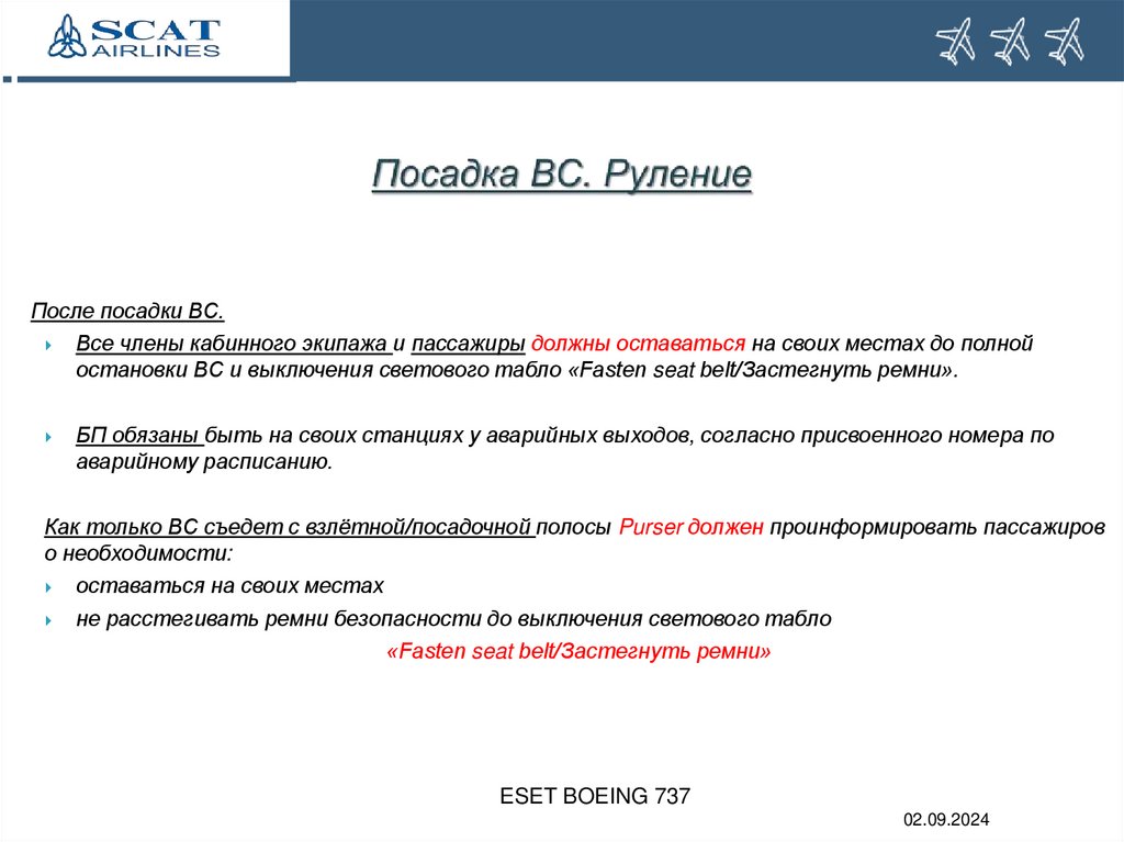 Как только ВС съедет с взлётной/посадочной полосы Purser должен проинформировать пассажиров