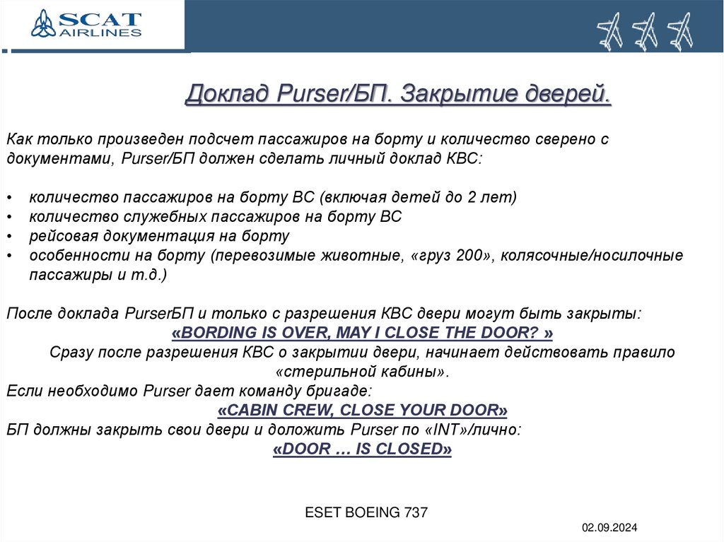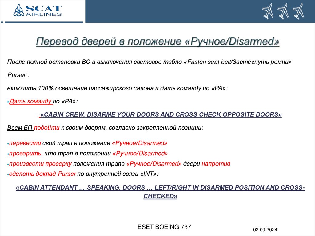 до покидания ВС, Purser должен убедиться, что все двери находятся в положении