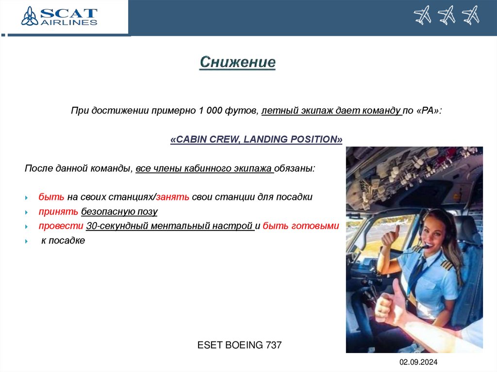 При достижении примерно 1 000 футов, летный экипаж дает команду по «РА»:«CABIN CREW, LANDING POSITION»