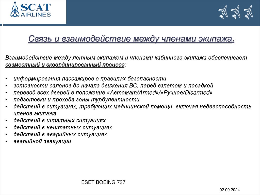 Связь и взаимодействие между членами экипажа.Взаимодействие между лётным экипажем и членами кабинного экипажа обеспечивает