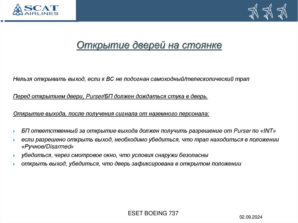 Нельзя открывать выход, если к ВС не подогнан самоходный/телескопический трапПеред открытием двери, Purser/БП должен дождаться стука в дверь.