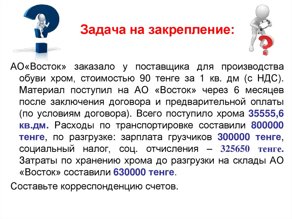 АО«Восток» заказало у поставщика для производстваобуви хром, стоимостью 90 тенге за 1 кв. дм (с НДС).