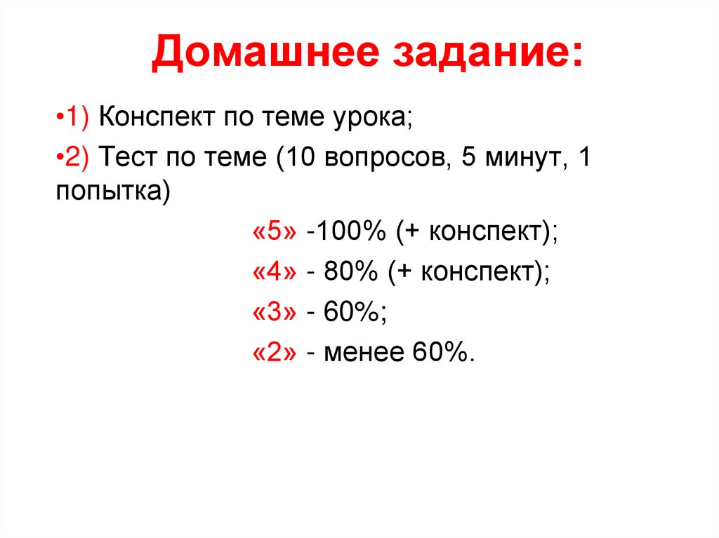 •1) Конспект по теме урока;•2) Тест по теме (10 вопросов, 5 минут, 1