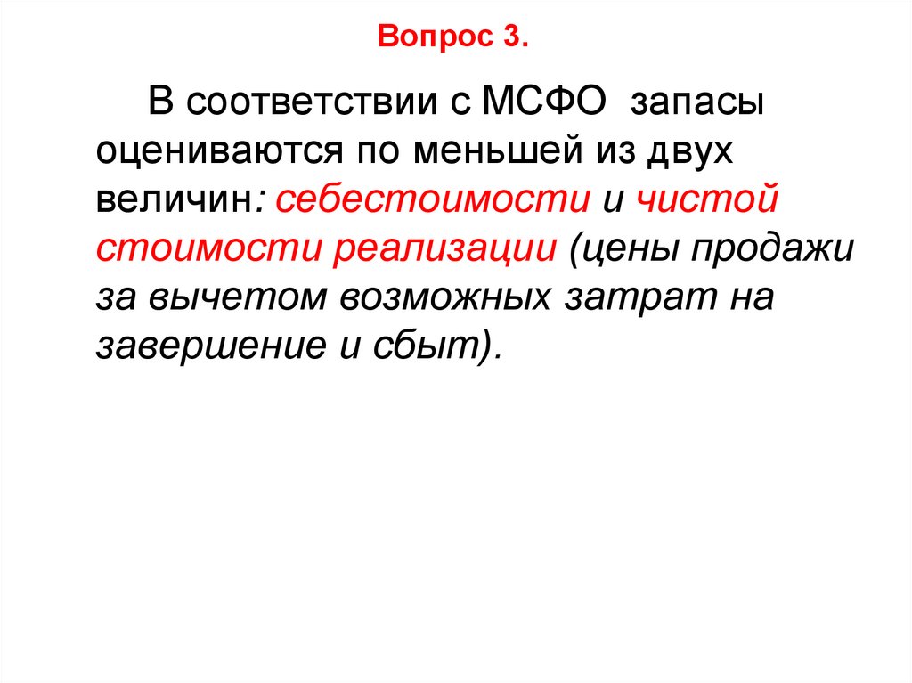 В соответствии с МСФО запасыоцениваются по меньшей из двух