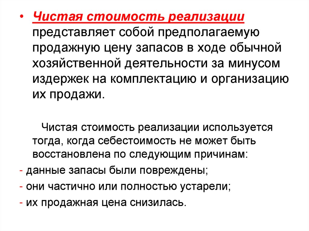 • Чистая стоимость реализациипредставляет собой предполагаемую