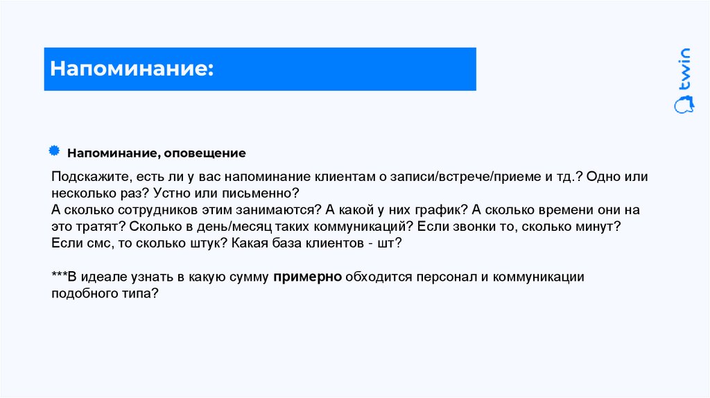 Смс рассылаете или звоните? А сколько сотрудников этим занимаются? А какой у них