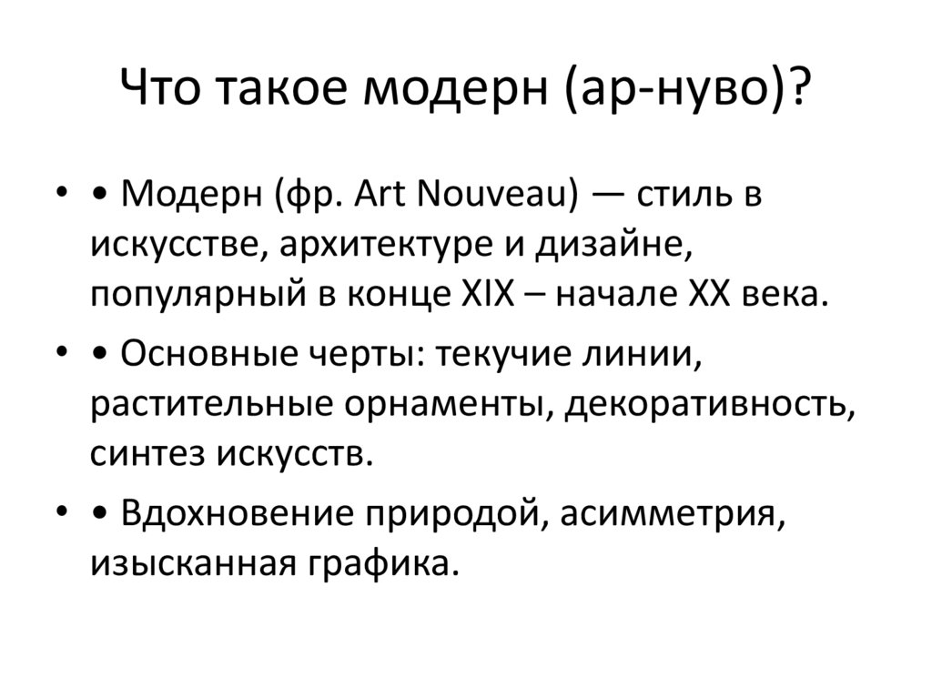 Что такое модерн (ар-нуво)?• • Модерн (фр. Art Nouveau) — стиль в