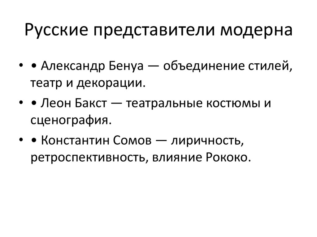 Русские представители модерна• • Александр Бенуа — объединение стилей,