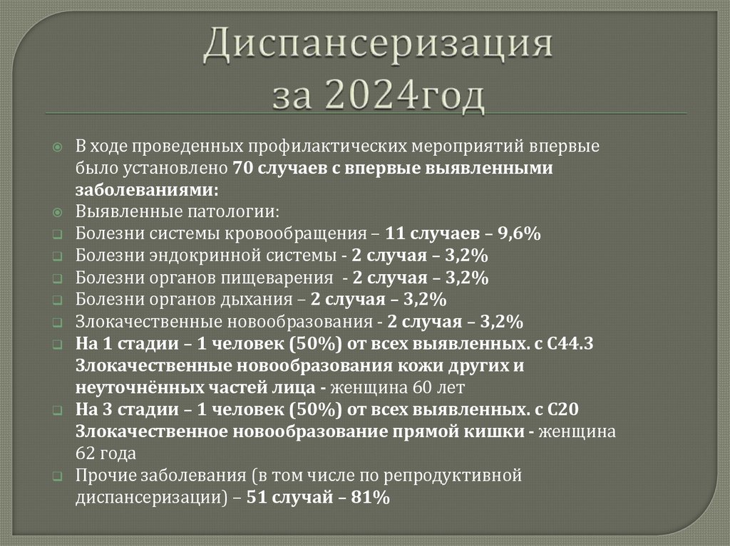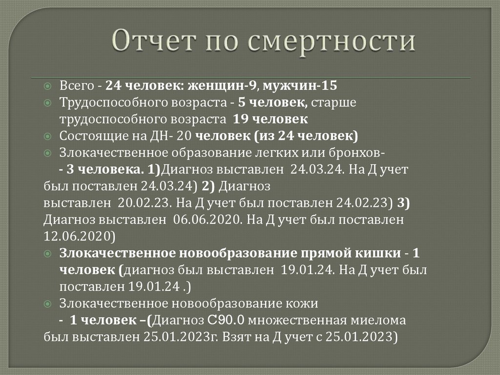 Злокачественное образование легких или бронхов- 3 человека. 1)Диагноз выставлен 24.03.24. На Д учет
