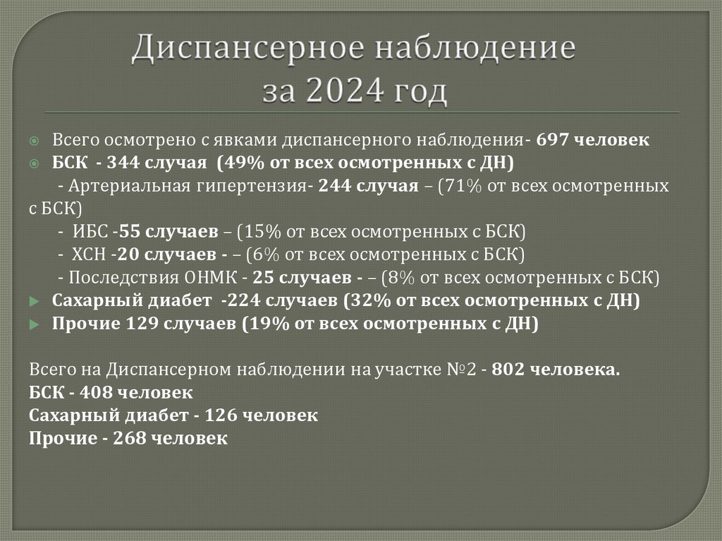 Всего осмотрено с явками диспансерного наблюдения- 697 человекБСК - 344 случая (49% от всех осмотренных с ДН)