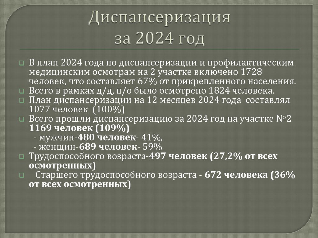 В план 2024 года по диспансеризации и профилактическиммедицинским осмотрам на 2 участке включено 1728