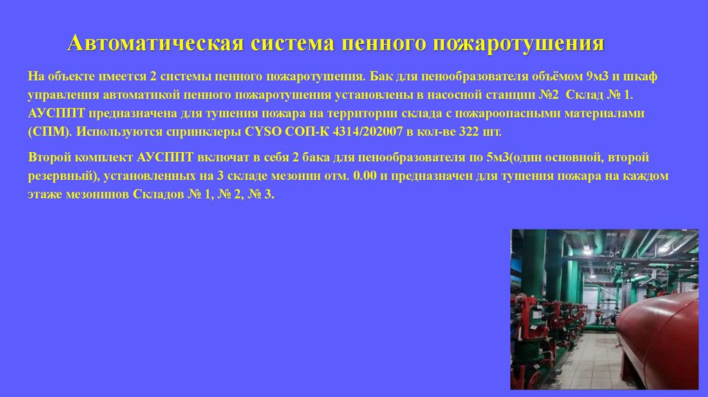 Автоматическая система пенного пожаротушенияНа объекте имеется 2 системы пенного пожаротушения. Бак для пенообразователя объёмом 9м3 и шкаф