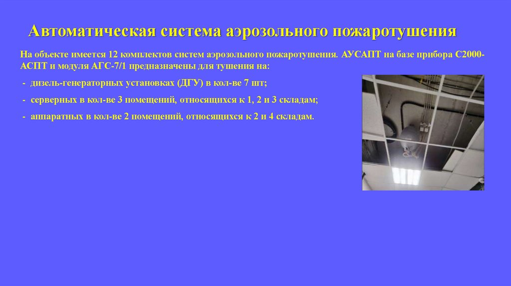 Автоматическая система аэрозольного пожаротушенияНа объекте имеется 12 комплектов систем аэрозольного пожаротушения. АУСАПТ на базе прибора С2000АСПТ и модуля АГС-7/1 предназначены для тушения на: