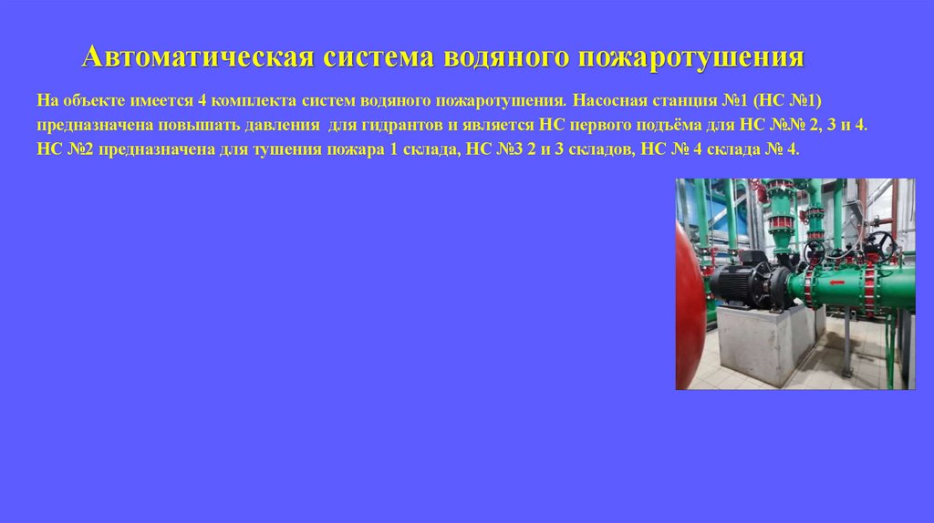 Автоматическая система водяного пожаротушенияНа объекте имеется 4 комплекта систем водяного пожаротушения. Насосная станция №1 (НС №1)