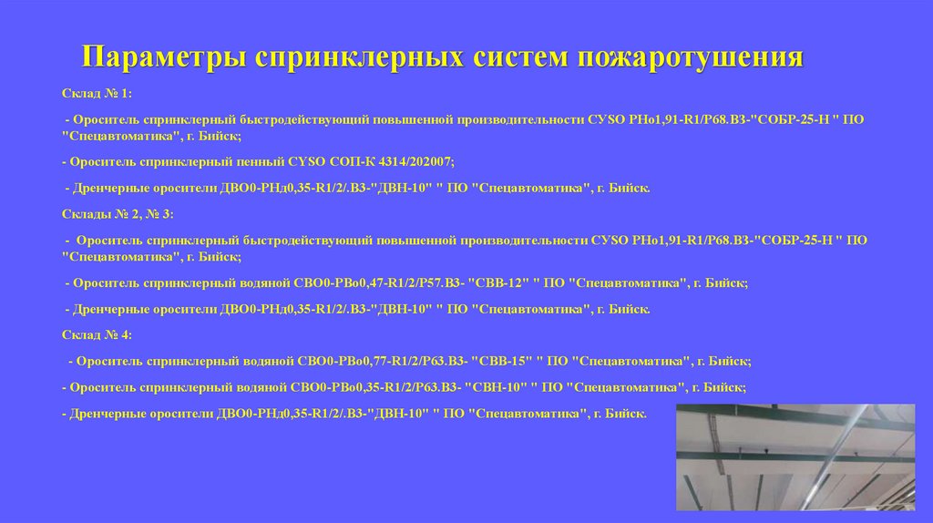 Параметры спринклерных систем пожаротушенияСклад № 1: