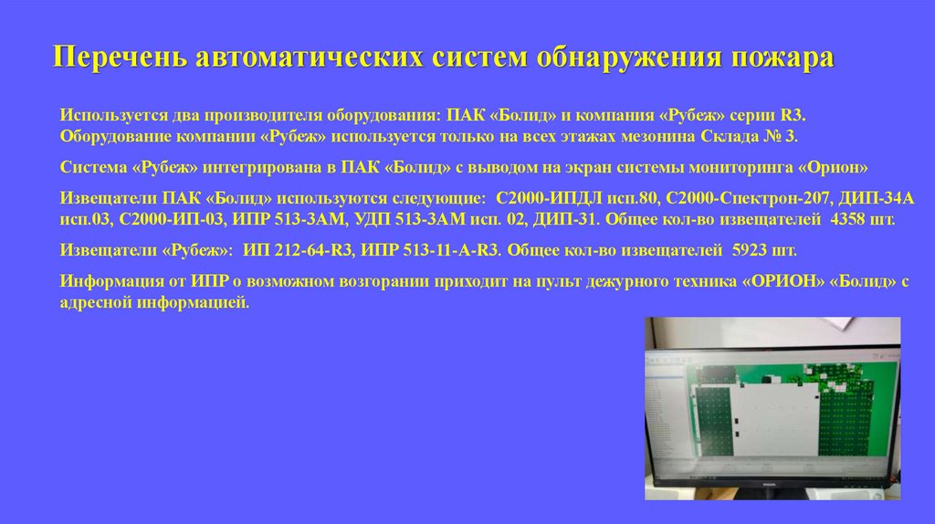 Перечень автоматических систем обнаружения пожараИспользуется два производителя оборудования: ПАК «Болид» и компания «Рубеж» серии R3.