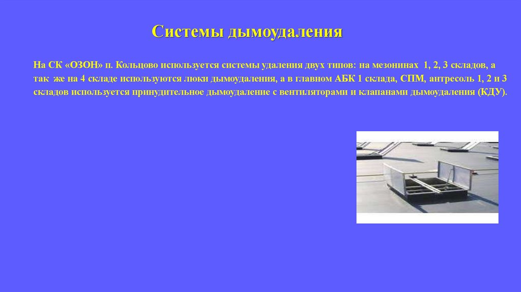 Системы дымоудаленияНа СК «ОЗОН» п. Кольцово используется системы удаления двух типов: на мезонинах 1, 2, 3 складов, а
