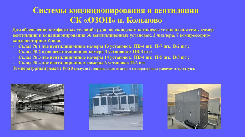 вентиляции и кондиционирования 36 вентиляционных установок, 3 чиллера, 7 компрессорноконденсаторных блока.