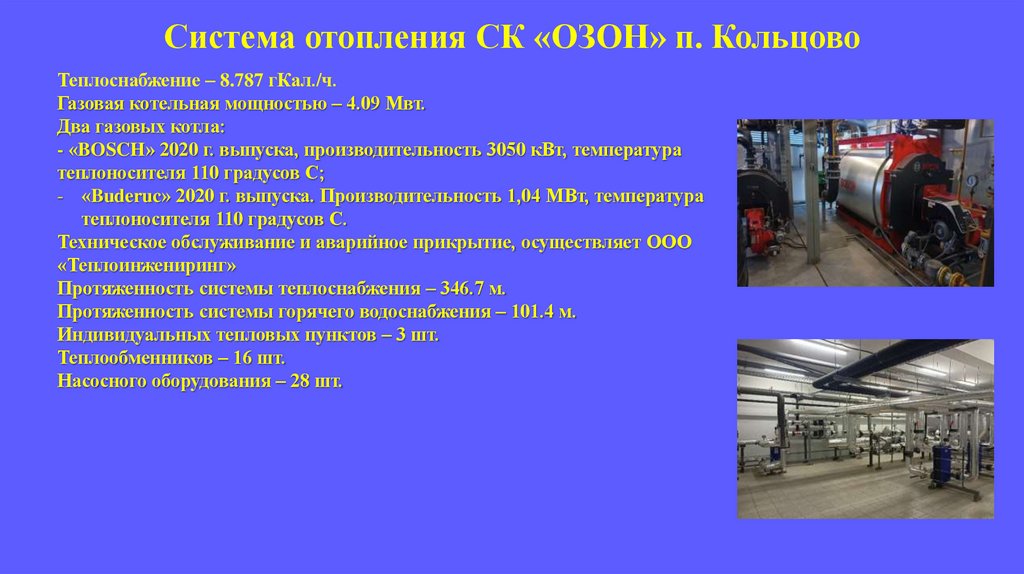 Система отопления СК «ОЗОН» п. КольцовоТеплоснабжение – 8.787 гКал./ч.
