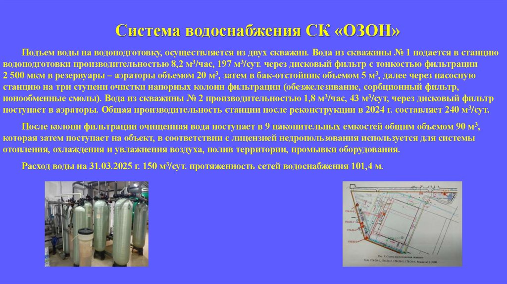 Система водоснабжения СК «ОЗОН»Подъем воды на водоподготовку, осуществляется из двух скважин. Вода из скважины № 1 подается в станцию