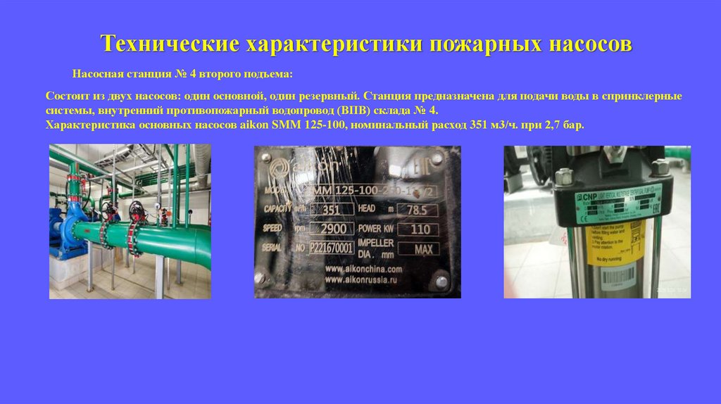 Технические характеристики пожарных насосовНасосная станция № 4 второго подъема: