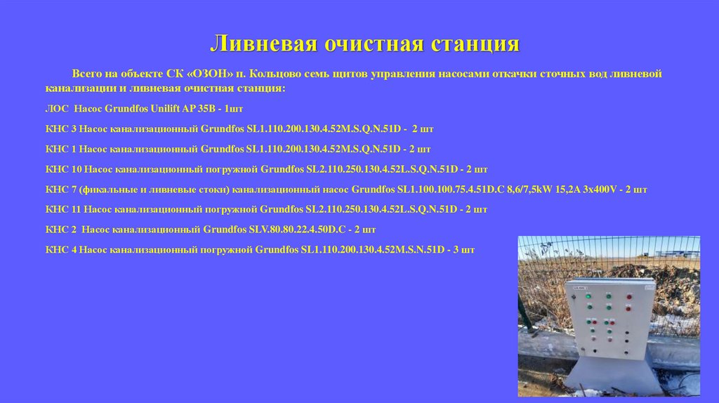 Ливневая очистная станцияВсего на объекте СК «ОЗОН» п. Кольцово семь щитов управления насосами откачки сточных вод ливневой